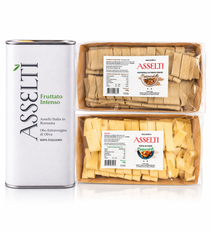 Set ASSELTI® Origine Italia – 1 x Ulei de masline extravirgin 1L Fruttato Intenso + 2 x Pappardelle (ou + porcini) 250g, produse premium italiene