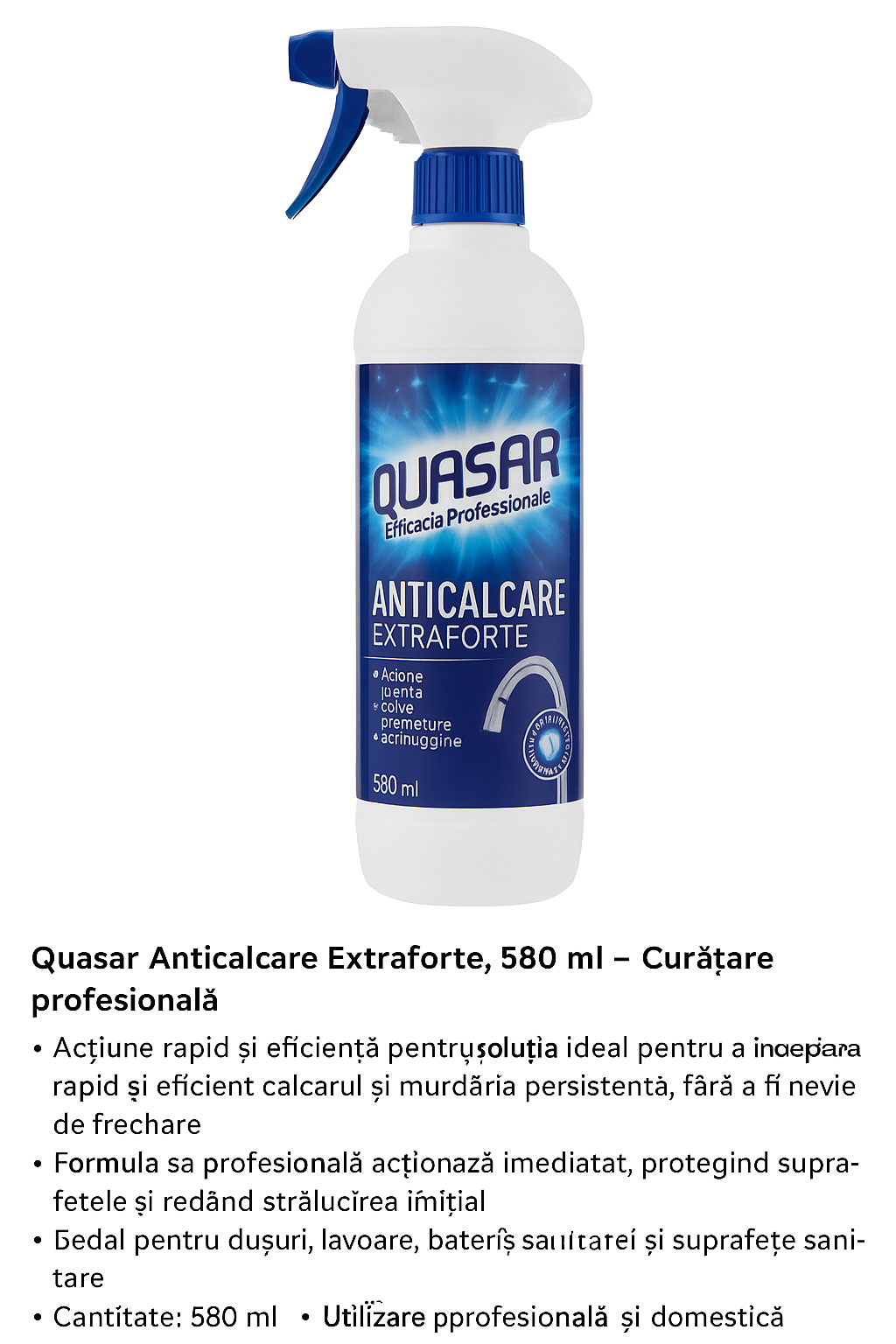 Quasar Anticalcare Extraforte este soluția ideală pentru a îndepărta rapid și eficient calcarul și murdăria persistentă, fără a fi nevoie de frecare. Formula sa profesională acționează imediat, protejând suprafețele și redând strălucirea inițială.