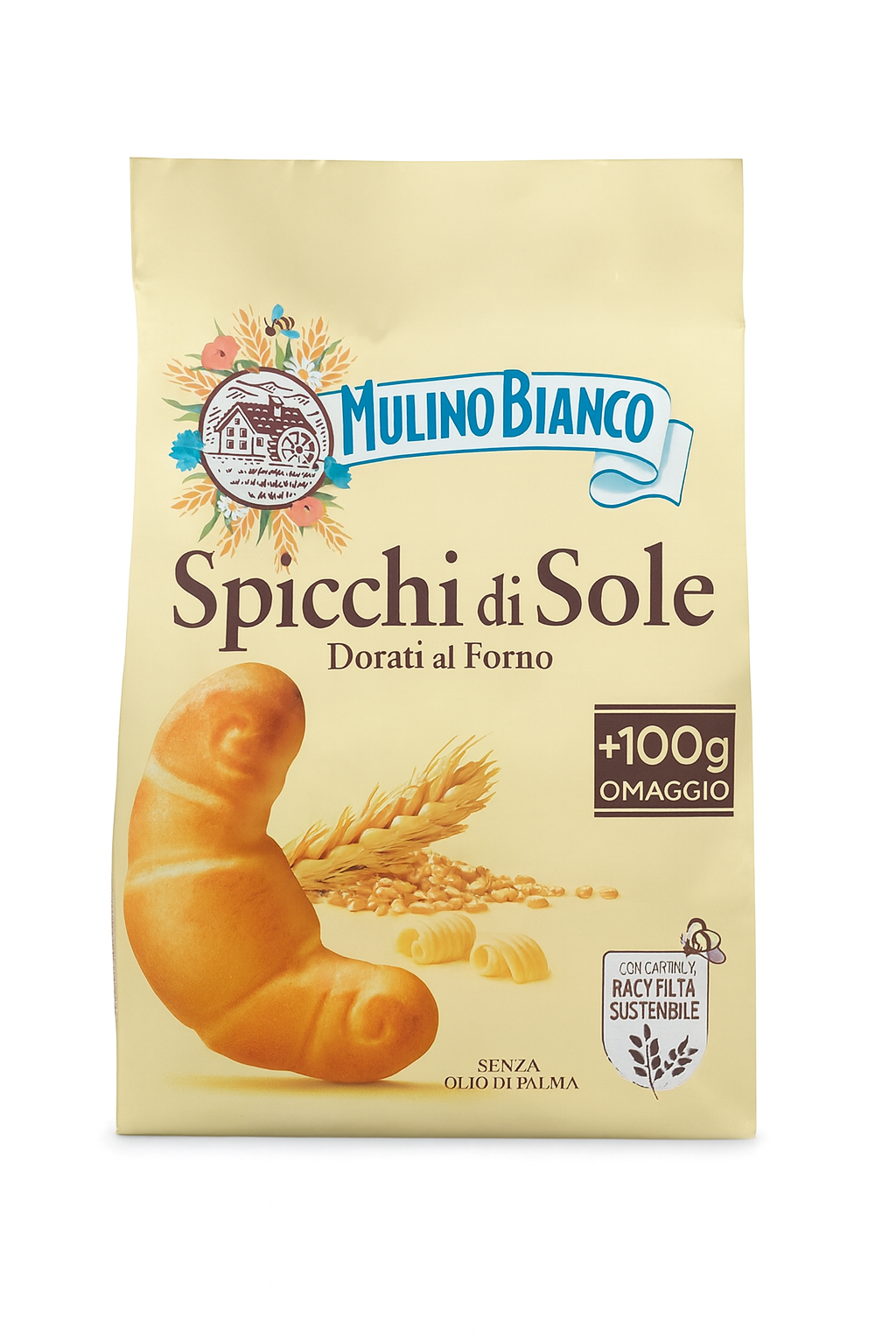 Bucură-te de gustul autentic italian cu Spicchi di Sole Mulino Bianco, cornuri moi și aurii, coapte la cuptor, perfecte pentru mic dejun sau gustări delicioase. Pregătite cu făină din agricultură sustenabilă și fără ulei de palmier.