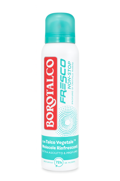 Trăiește prospețimea continuă cu Borotalco Fresco Non-Stop, deodorant spray cu Talco Vegetale™ și Molecule Răcoritoare, conceput pentru a oferi o senzație de piele uscată și parfumată timp de până la 72 de ore.
