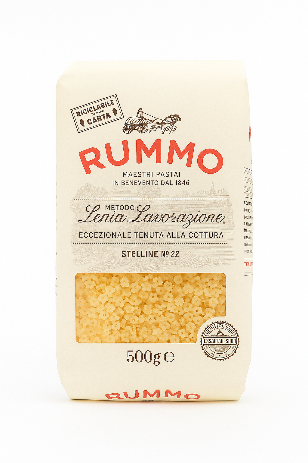 Rummo Stelline Nr. 22 sunt paste italiene de calitate superioară, realizate din grâu dur și produse în Italia prin celebrul Metod Lenta Lavorazione – un proces tradițional lent care asigură o textură perfectă și o rezistență excepțională la gătire.