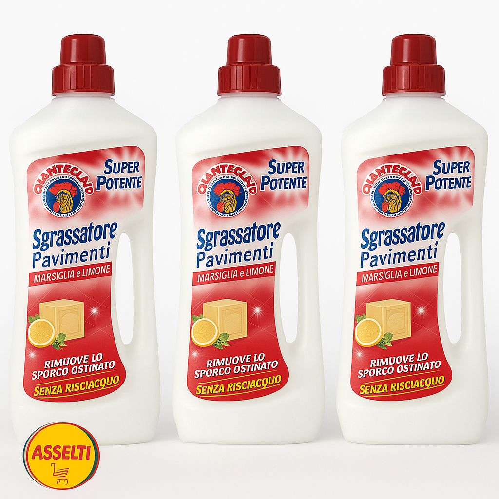 Setul ASSELTI® Origine Italia include 3 sticle de detergent pentru pardoseli Chanteclair Sgrassatore Pavimenti, cu parfum de Marsilia și lămâie. Formula sa super-potentă îndepărtează rapid grăsimea, murdăria persistentă și urmele dificile, lăsând pardoselile impecabile și intens parfumate. Ideal pentru gresie, faianță, suprafețe lavabile și zone cu trafic intens.