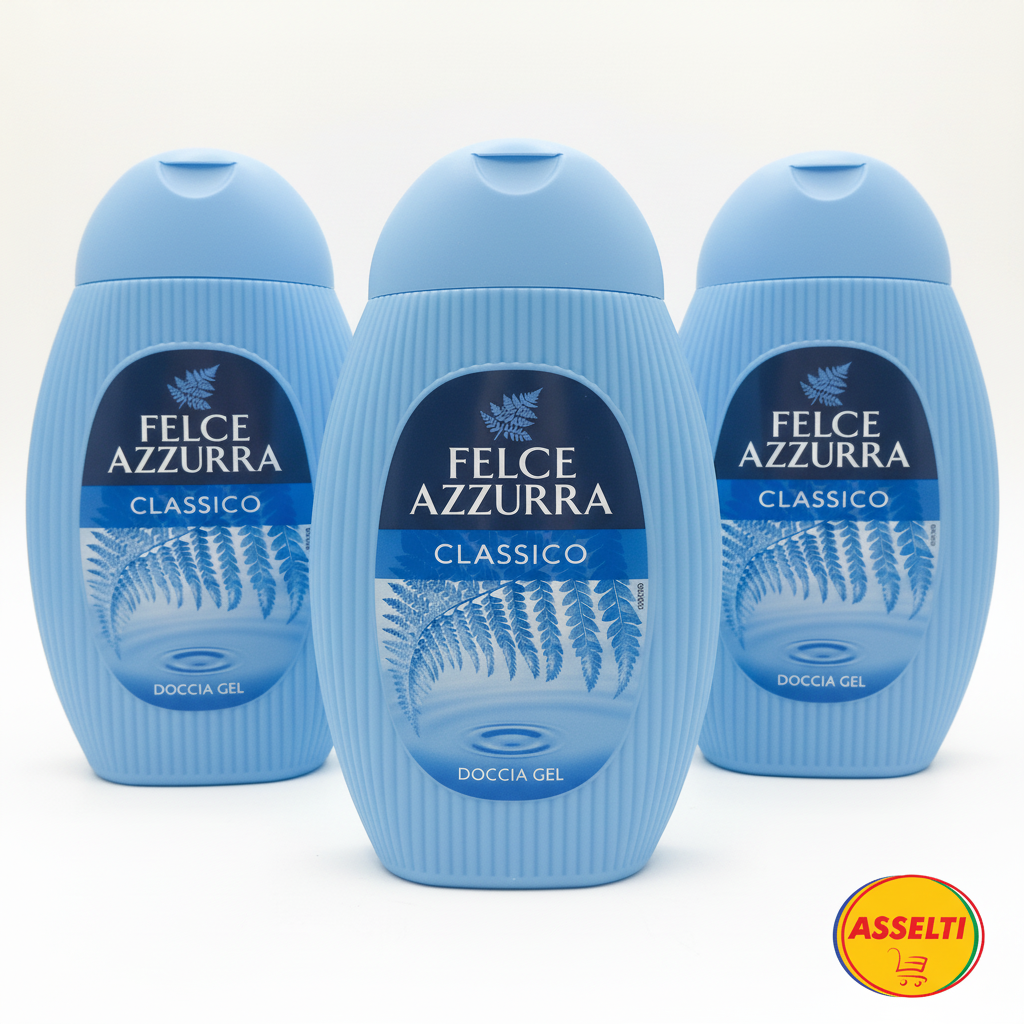 Set ASSELTI® Origine Italia – 3 x Felce Azzurra Doccia Gel Classico 250 ml, prospețime și curățare delicată