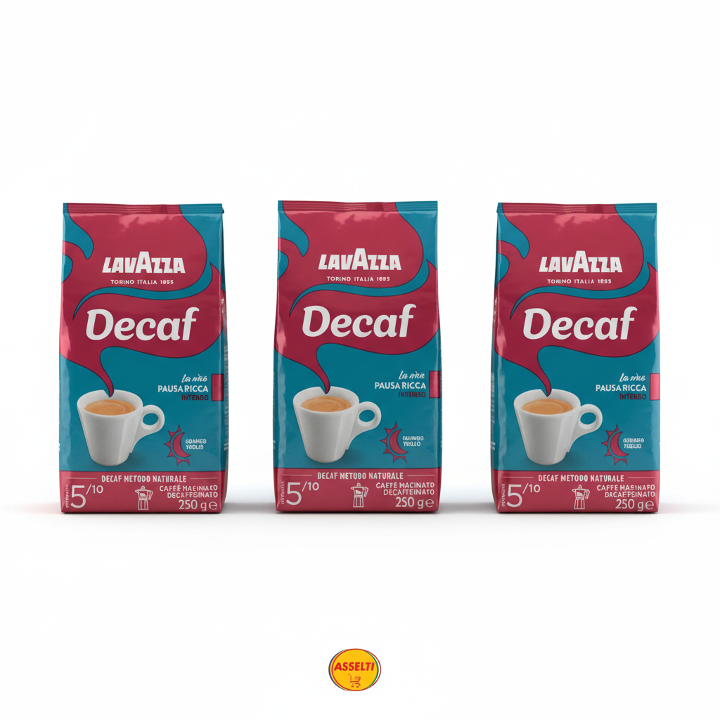 Set ASSELTI® Origine Italia – 3 x Lavazza Decaf 250 g, cafea măcinată decofeinizată cu aromă intensă