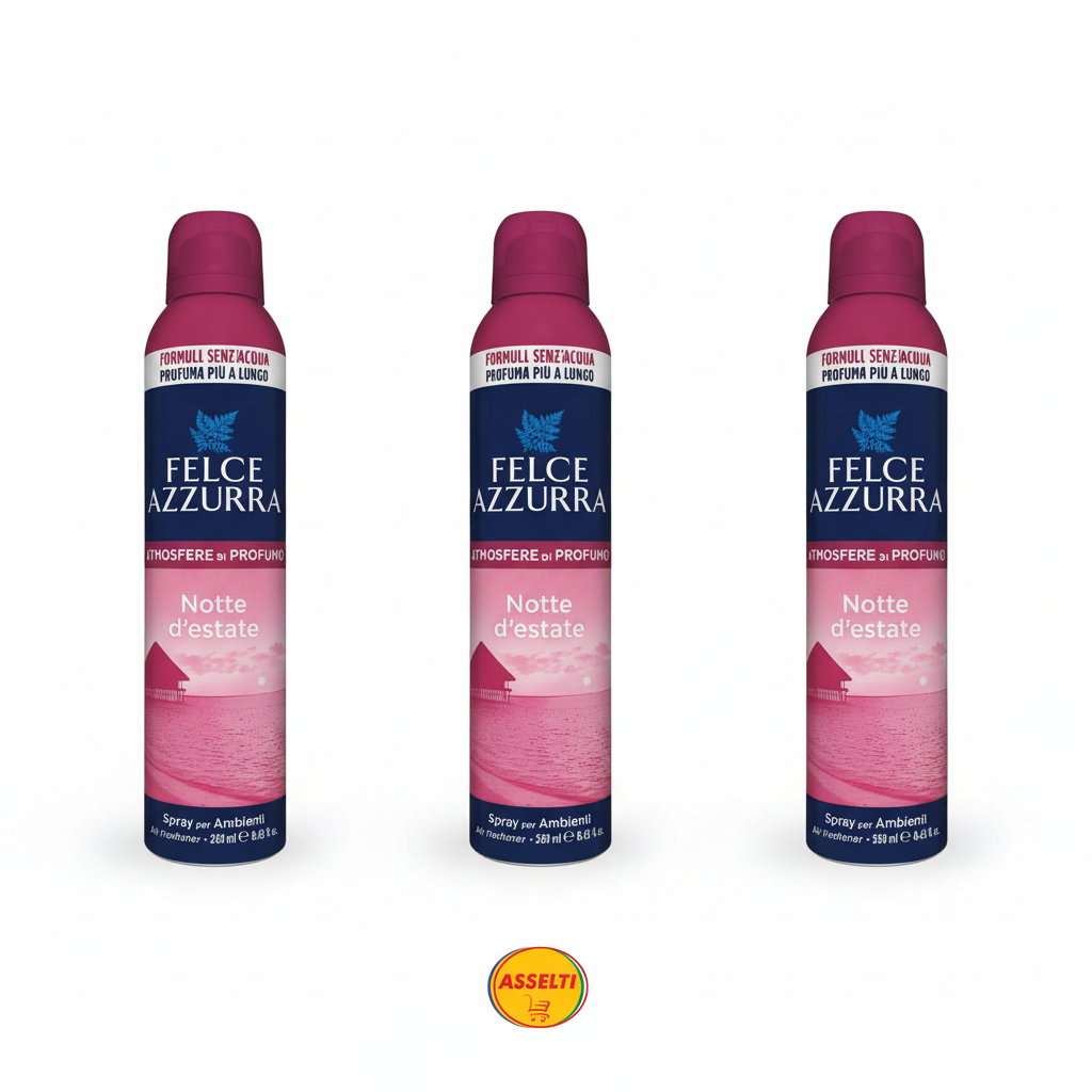 Set ASSELTI® Origine Italia – 3 x Felce Azzurra Spray Ambienti Notte d’Estate 250 ml, odorizant cu parfum cald și romantic de vară