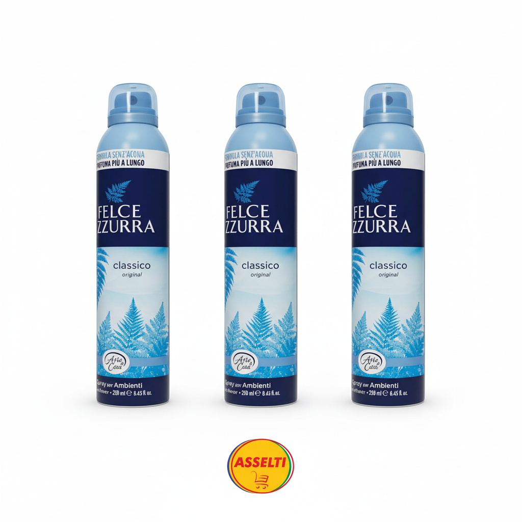 Set ASSELTI® Origine Italia – 3 x Felce Azzurra Spray Ambienti Classico 250 ml, odorizant cu parfum proaspăt și inconfundabil