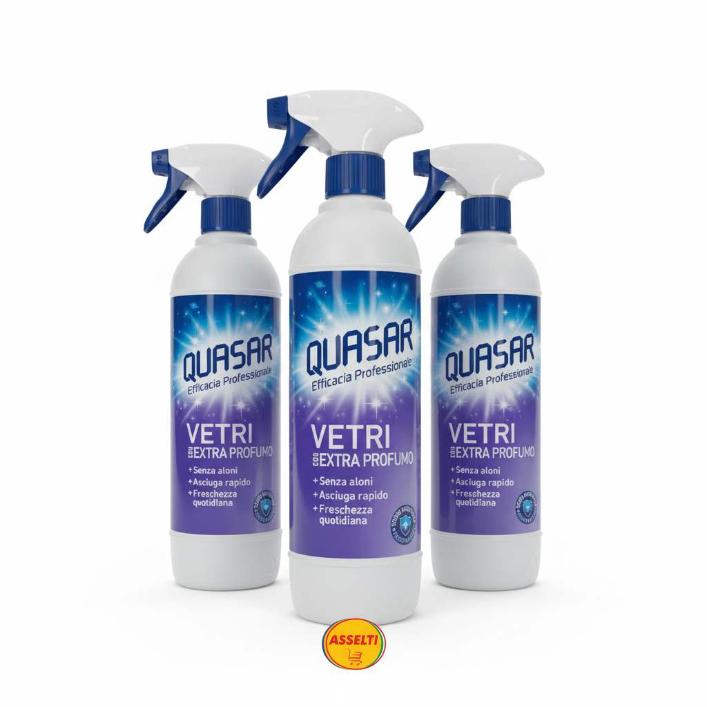 Set ASSELTI® Origine Italia – 3 x Quasar Vetri Extra Profumo 650 ml, detergent pentru geamuri fără urme și parfum intens