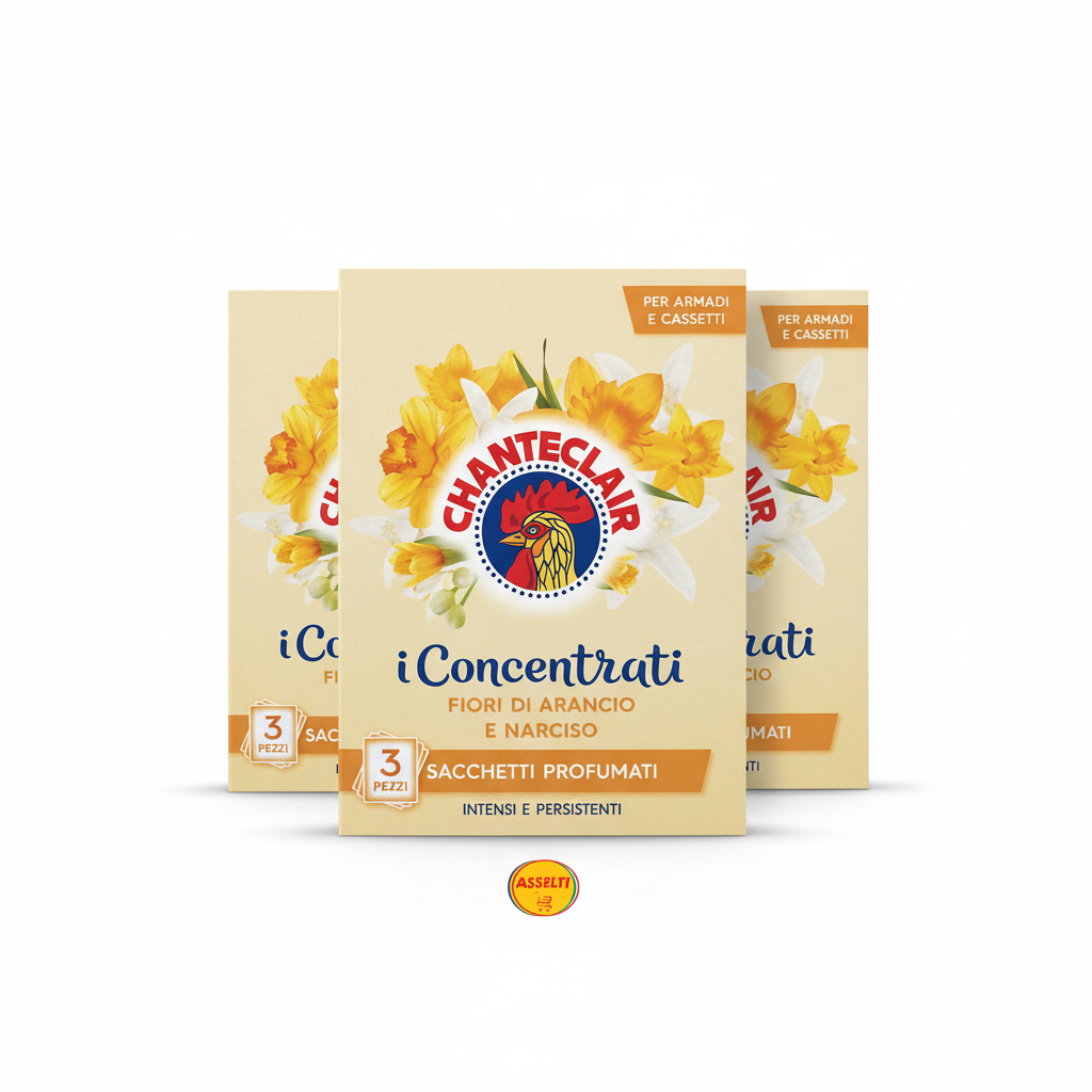 Setul conține 3 pachete Chanteclair I Concentrati, fiecare cu 3 săculeți parfumați, special formulați pentru a împrospăta dulapurile, sertarele, pantofarele și spațiile mici închise. Parfumul Fiori di Arancio e Narciso combină notele luminoase de floare de portocal cu aroma florală intensă a narcisei, oferind o atmosferă caldă, elegantă și persistentă.
