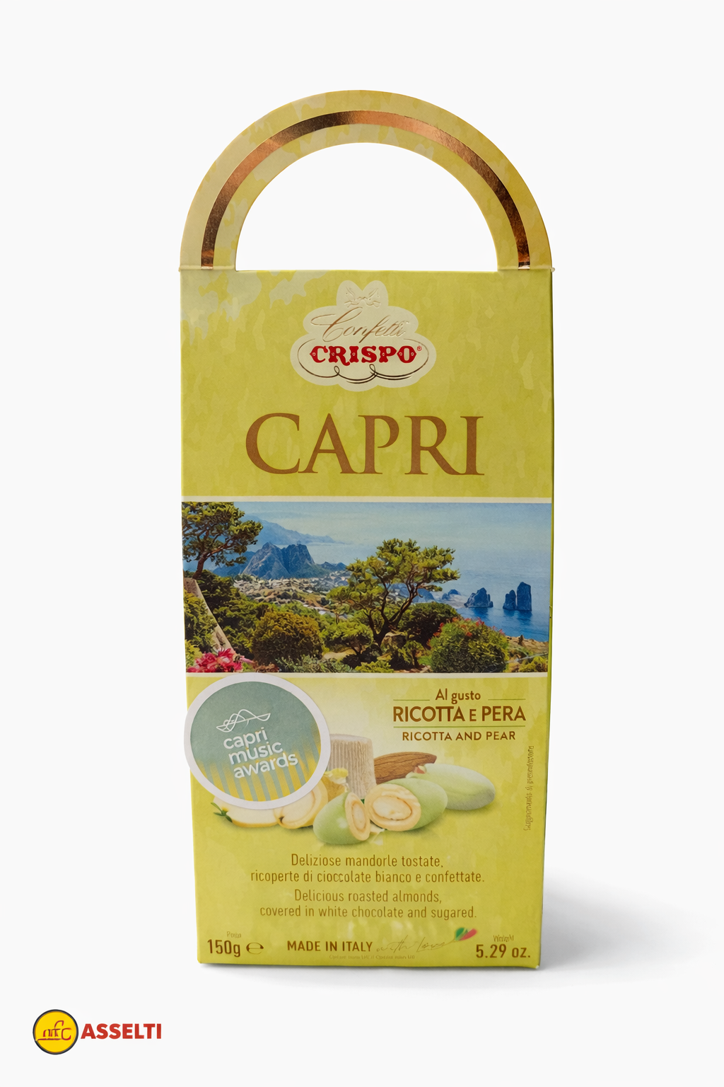 Confetti Crispo Capri Ricotta și Pară – Migdale prăjite în ciocolată albă, 150 g, Made in Italy