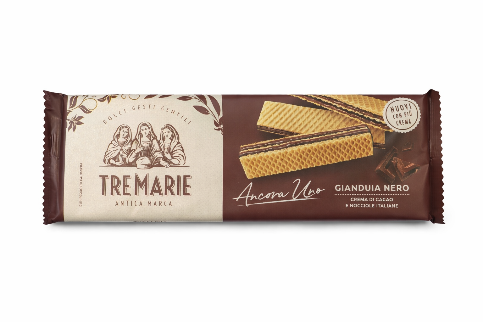 Napolitane Tre Marie Ancora Uno Gianduia Nero 140 g, realizate din foi crocante umplute cu cremă fină de cacao și alune italiene. Un produs premium din tradiția Tre Marie, creat pentru iubitorii de gusturi intense și autentice.