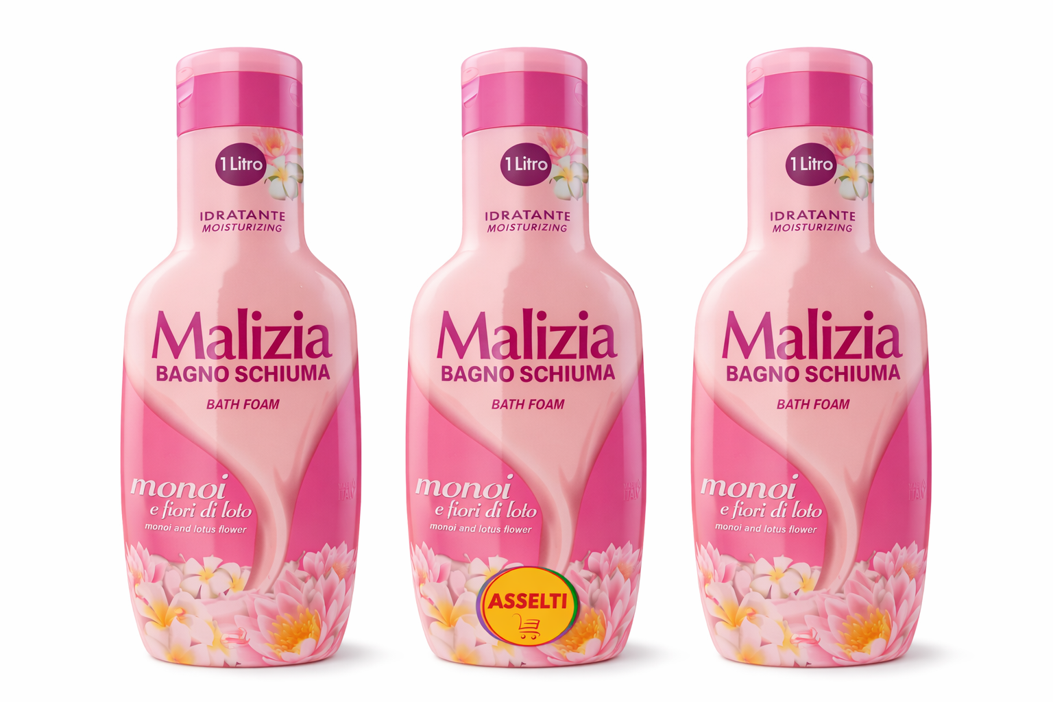 Set 3 x Malizia Bagno Schiuma Monoi & Flori de Lotus – 1 L, Hidratant, Fabricat în Italia