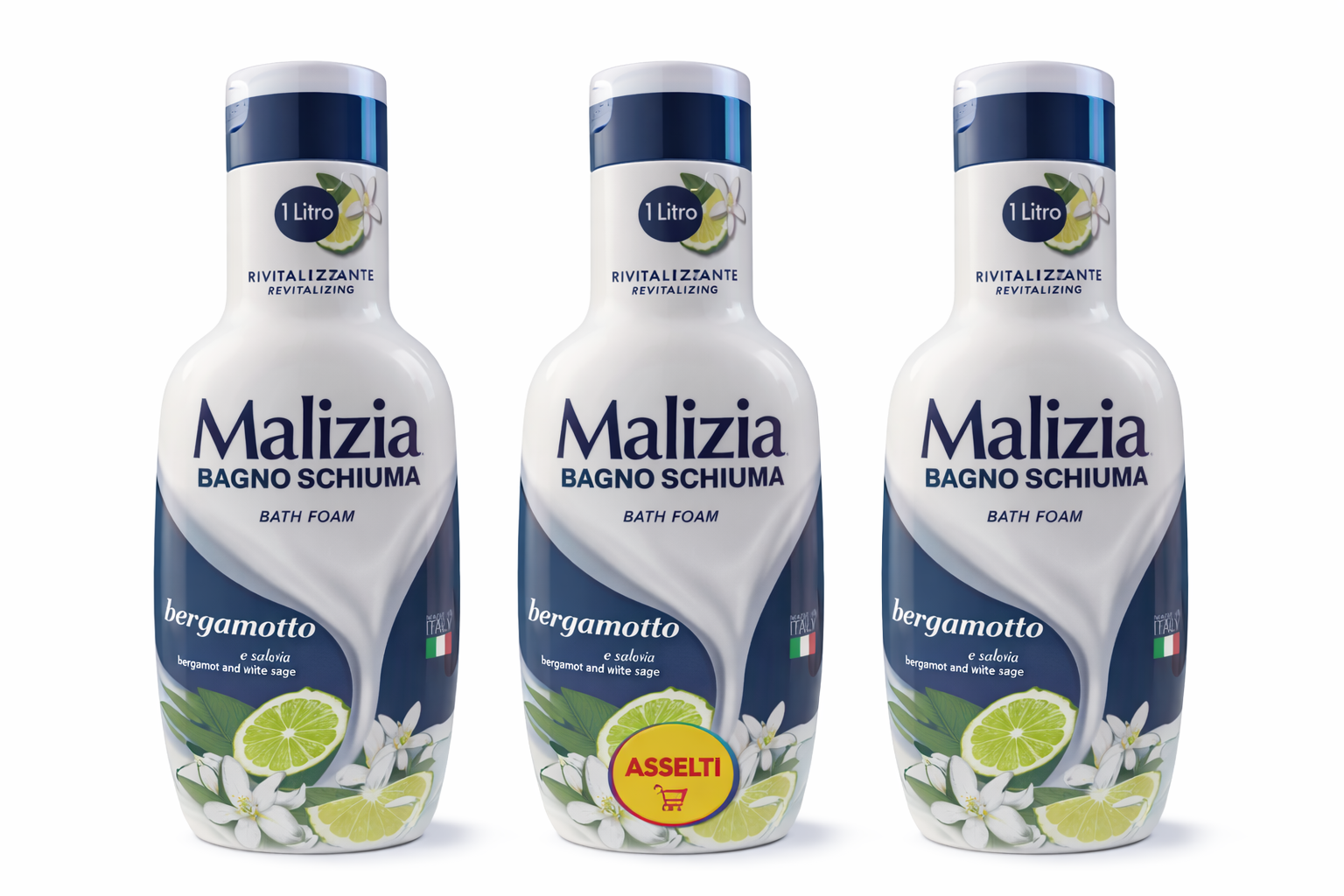 – 3 x Malizia Bagno Schiuma Bergamot și Salvie Albă, 1 L