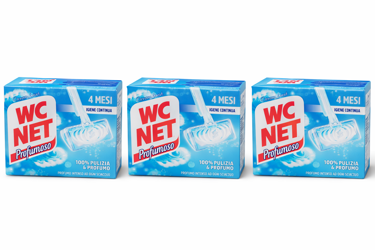 Setul WC NET® Profumoso Ocean Fresh – 3 × 34 g este soluția ideală pentru menținerea toaletei curate și plăcut parfumate zi de zi. Fiecare cutie conține 3 blocuri a câte 34 g, concepute pentru a oferi igienă continuă timp de până la 4 luni.