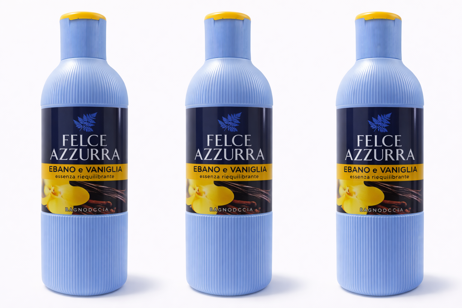 Set 3 x Gel de duș Felce Azzurra Ebano & Vanilie – 650 ml/buc, aromă caldă și echilibrantă