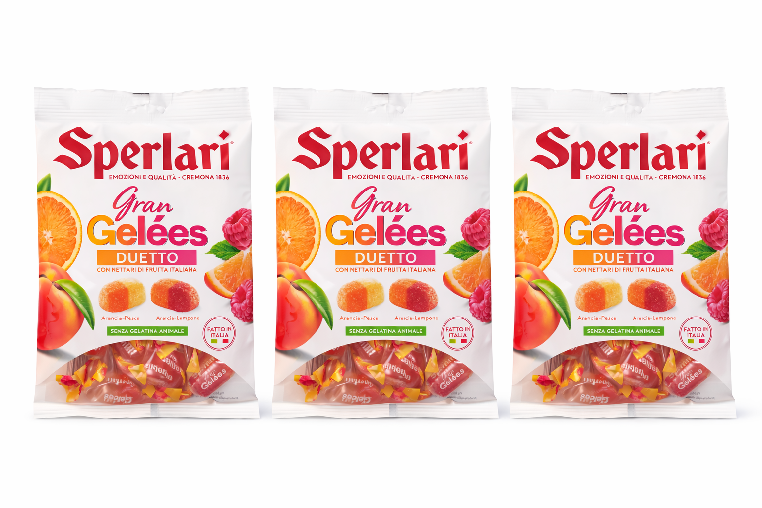 Setul conține 3 pungi Sperlari Gran Gelées Duetto, fiecare de 150 g, cu jeleuri fine realizate din nectar de fructe italiene, după rețeta tradițională Sperlari.