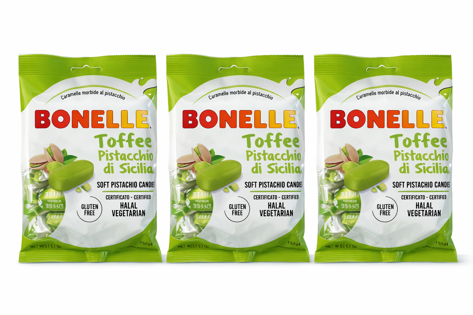 Setul conține 3 pungi a câte 150 g de Bonelle Toffee Pistachio di Sicilia, bomboane moi cu gust intens de fistic, inspirate din tradiția siciliană.