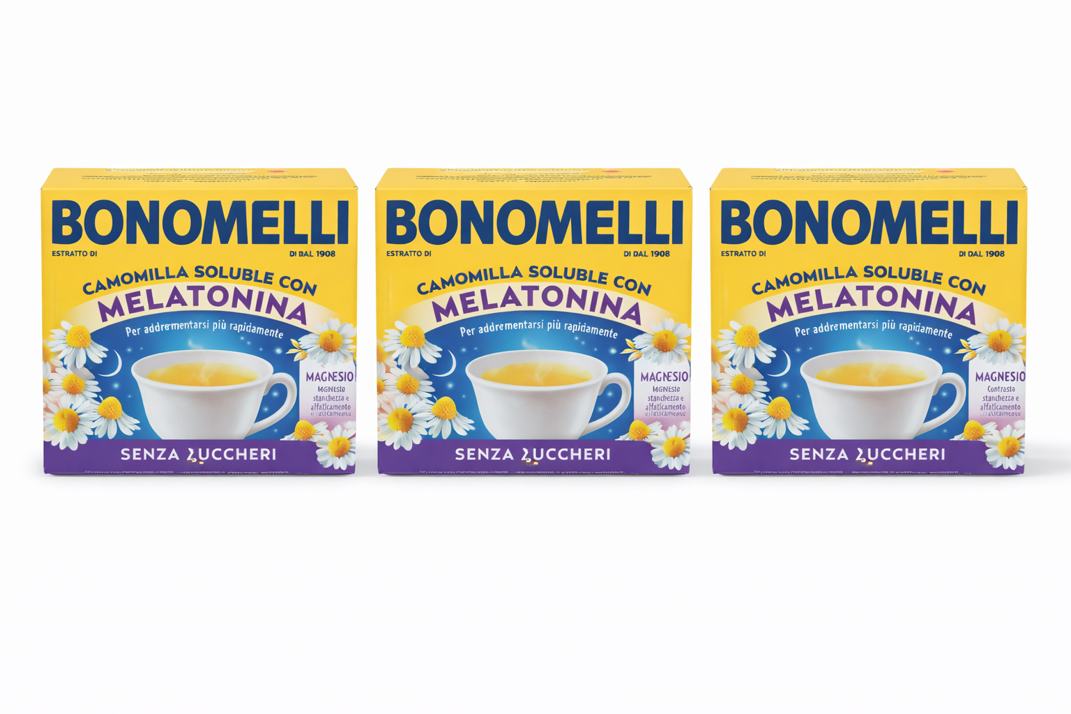 Bonomelli Camomilla Solubilă cu Melatonină – 72 g, 16 Pliculețe, Fără Zahăr, cu Magneziu