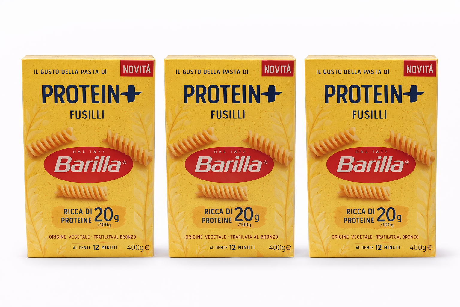 Setul conține 3 cutii de Barilla Protein+ Fusilli, fiecare de 400 g, paste italiene create pentru cei care își doresc un aport proteic mai ridicat, fără a renunța la gustul clasic al pastelor Barilla.