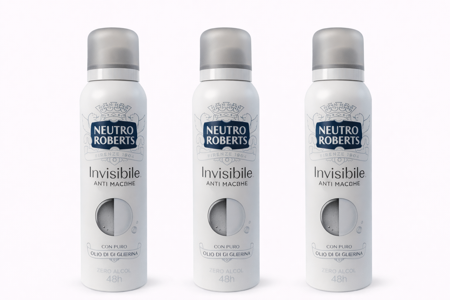 Setul conține 3 deodorante spray Neutro Roberts Invisible Anti-Pete, fiecare cu capacitate de 150 ml, concepute pentru a oferi protecție eficientă timp de până la 48 de ore, fără a lăsa urme albe sau galbene pe haine.