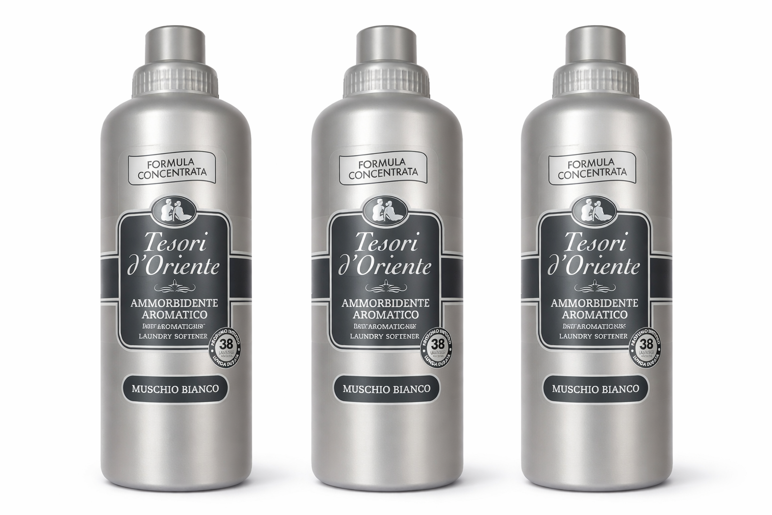 Setul conține 3 balsamuri de rufe Tesori d’Oriente Muschio Bianco, fiecare cu 760 ml, cu formulă concentrată, concepută pentru a oferi rufelor un parfum elegant, intens și de lungă durată.