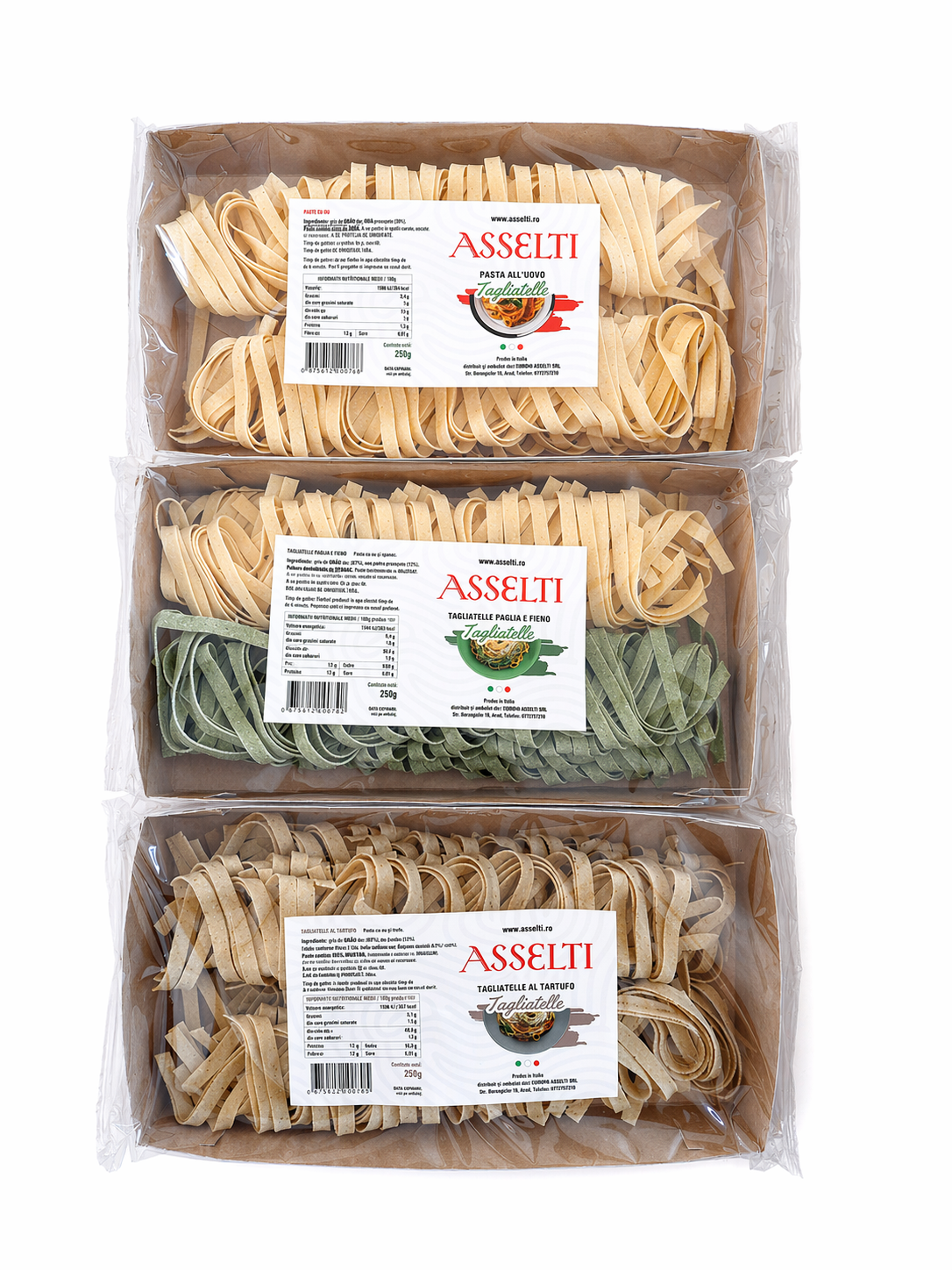 Set ASSELTI® Origine Italia – 3 x Tagliatelle 250g, paste all’uovo artizanale (clasic, paglia e fieno, trufe)