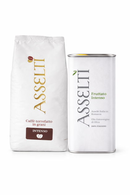 Set ASSELTI Origine Italia – Cafea boabe 1kg Intenso + Ulei de măsline extravirgin 1L Fruttato Intens, 100% italian