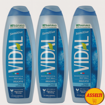 Set ASSELTI® Origine Italia – 3 x Vidal Sensitive Talco Liquido 500 ml, gel de duș delicat pentru piele sensibilă